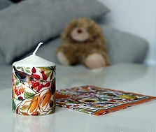 Декупаж свечи - вариант упрощенный, т.к. лаком и соединяющим веществом служит воск, и на высыхание требуется не более минуты.